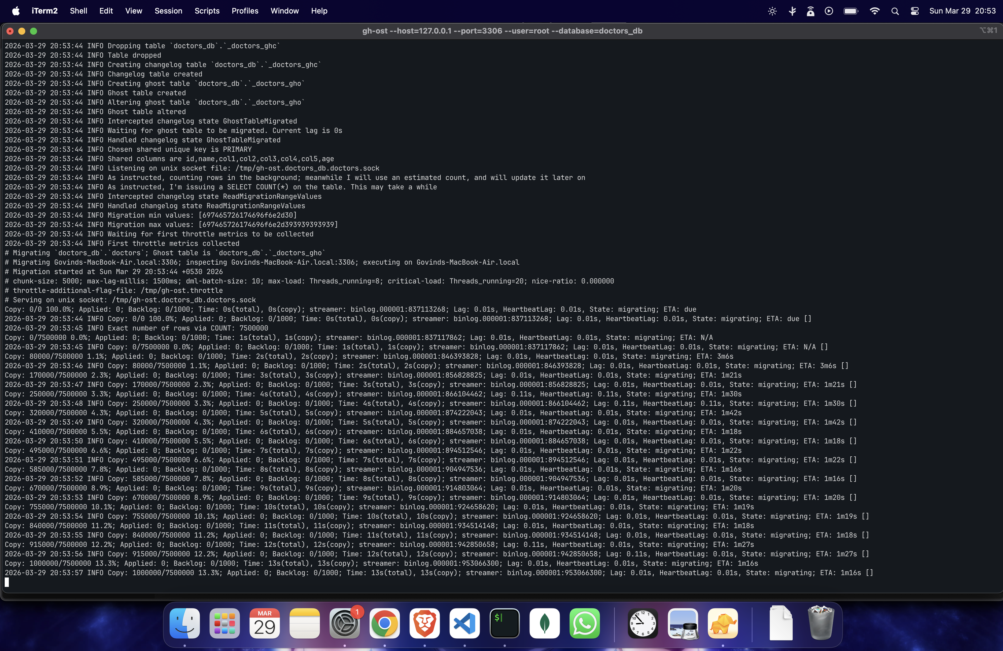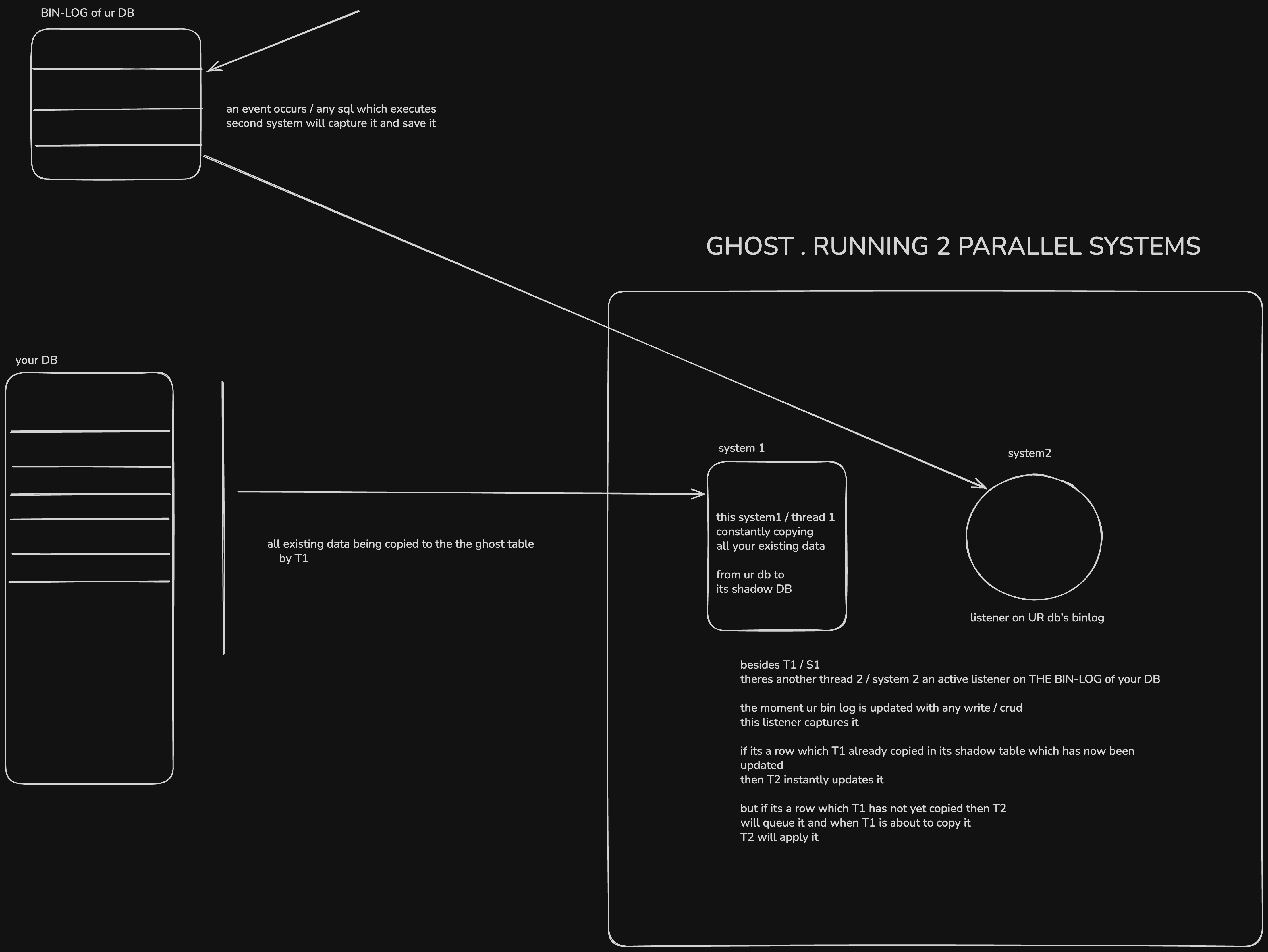- the moment you run the ghost command it starts making a shadow / ghost table of your original table with all the flags and uses bin-log streaming, with whatever batch / sleep you specify