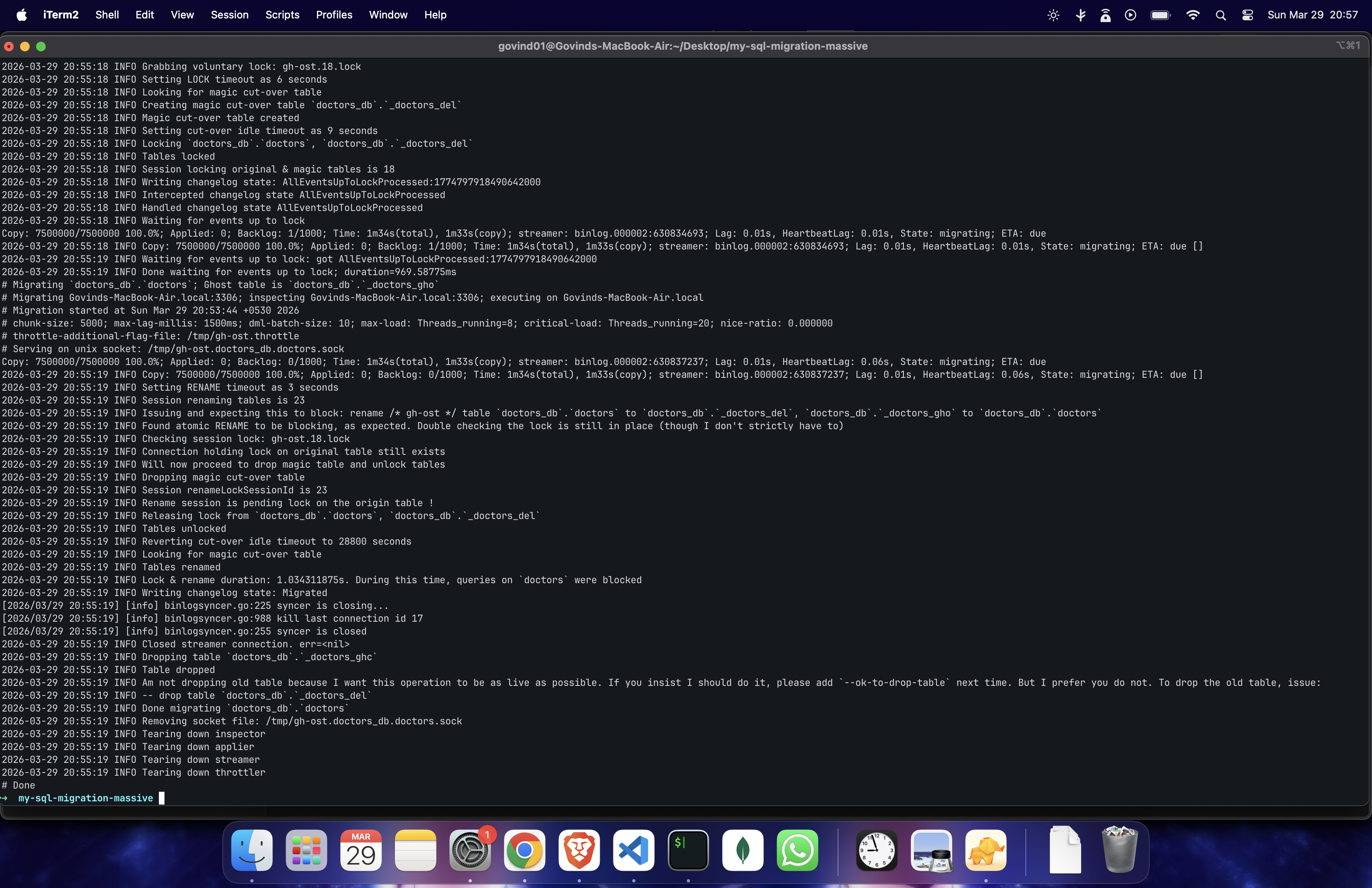 i still remember that night — mysql ALTER TABLE took 1089 seconds. that's 17+ minutes of staring at a terminal, sweating.
